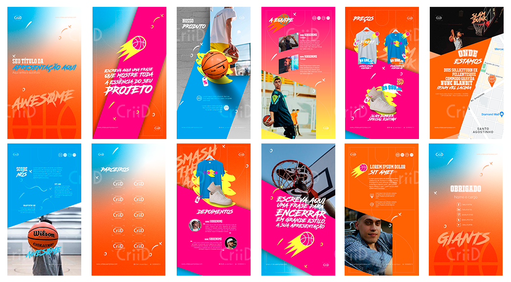 Slam Dunk é uma identidade visual inspirada no esporte, mais precisamente no basket. Nela você irá encontrar cores vibrantes, texturas trabalhadas no estilo street, elementos gráficos que remetem ao dinâmico, radical e jovial.